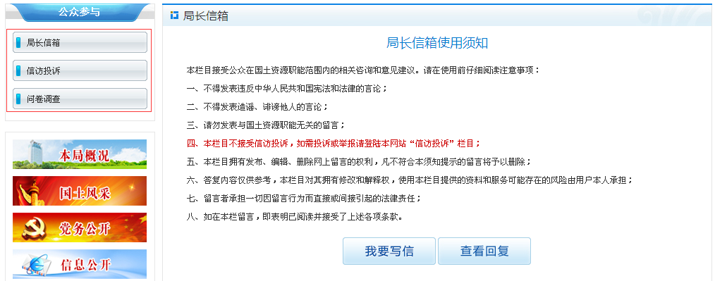 实现了为民服务、信访举报、反映问题和咨询的功能。针对公众关切,特别是重要会议、重要活动、重要决策部署,通过召开新闻发布会、参与行风热线访谈、网站热点回应、政务微博互动等活动形式,加强政民互动交流,增进公众对国土资源管理工作的了解和理解。