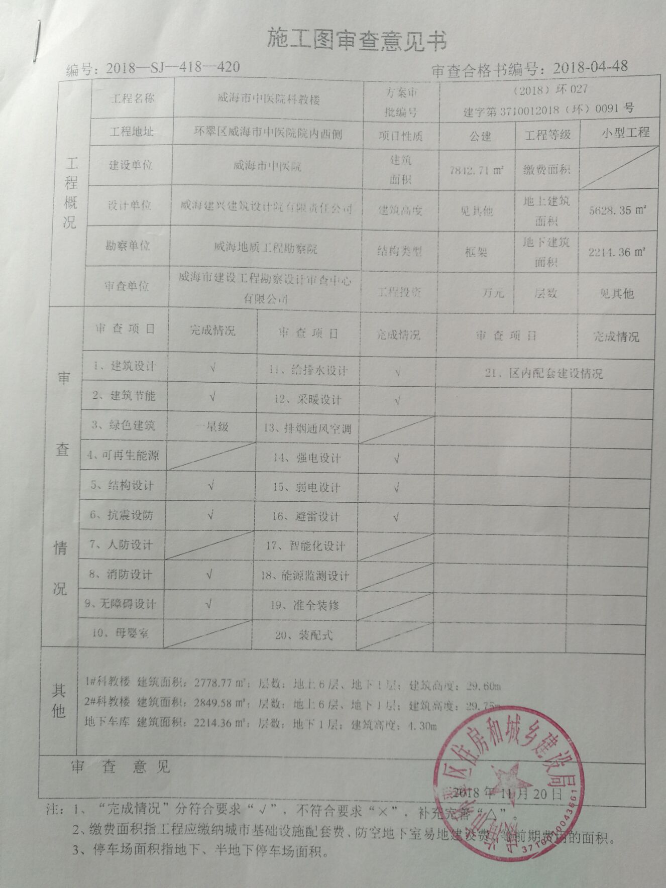 十大网赌靠谱网址平台 设计审批结果 市中医院康复中心项目施工图审查意见书
