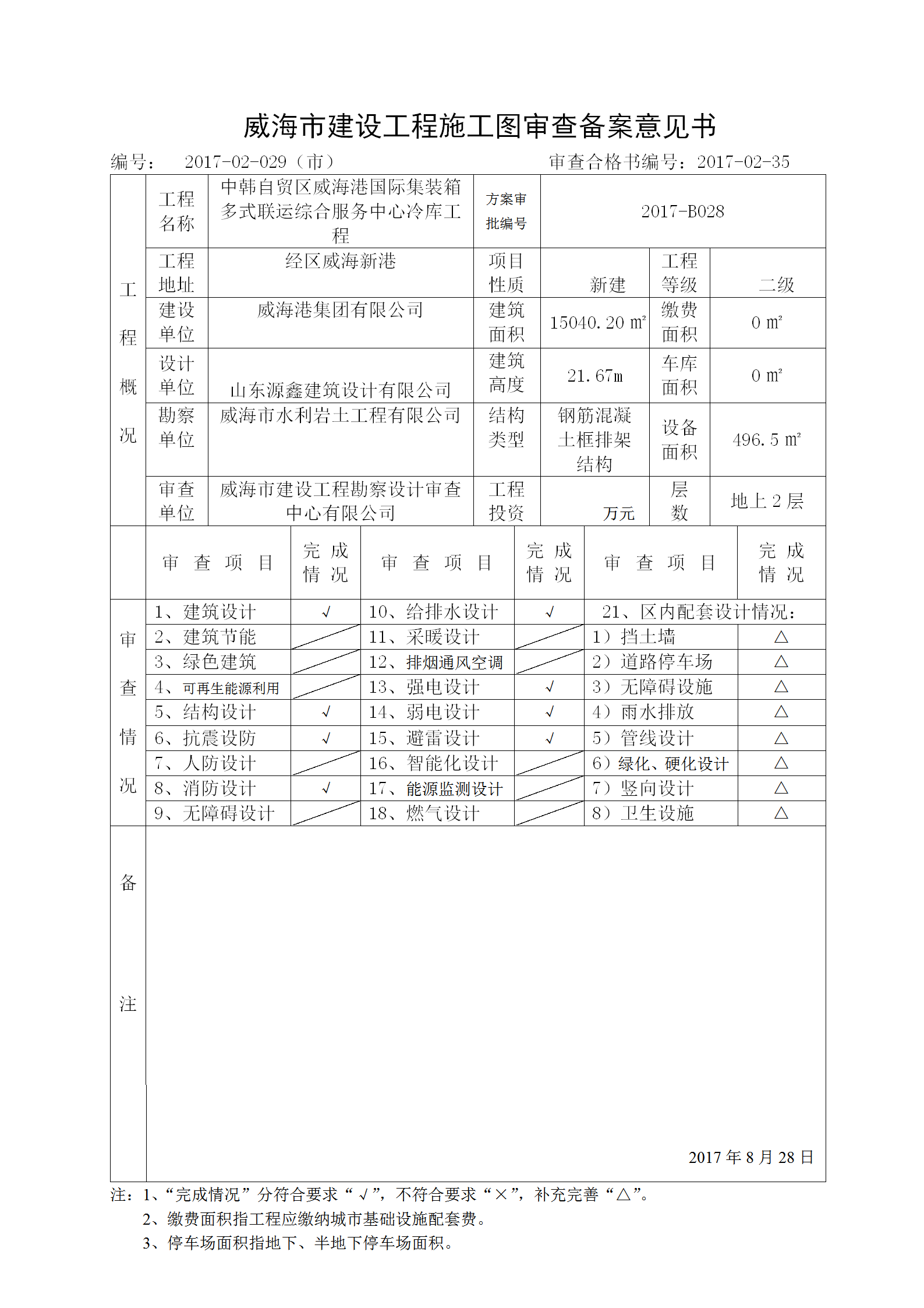 中韩自贸区十大网赌靠谱网址港国际集装箱多式联运综合服务中心冷库工程施工图审查备案意见书
