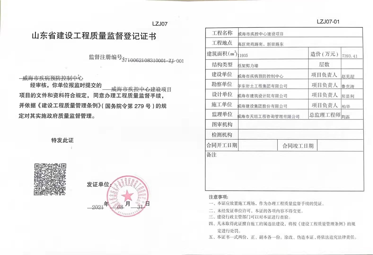 十大网赌靠谱网址平台 质量安全监督信息 建设工程质量监督登记证书