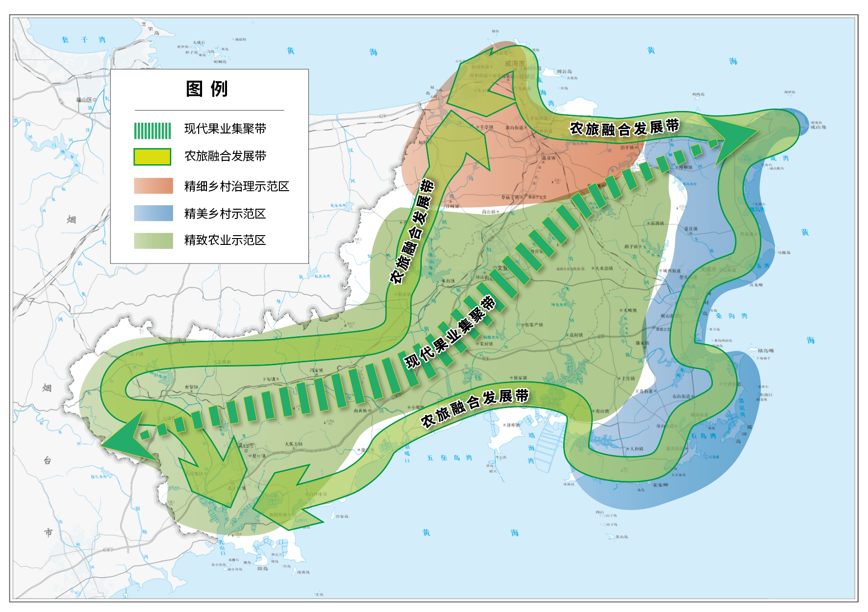 现代果业集聚带。沿西部的岠嵎山、西北部的昆嵛山、北部的里口山、老虎山、正棋山和东部的伟德山,自西向东串联乳山市、文登区、环翠区和荣成市的丘陵山区地带,形成现代果品产业集聚区。在岠嵎山片区,重点发展苹果、葡萄、浆果、桃产业;在昆嵛山片区,重点发展樱桃、苹果、梨、桃产业;在里口山、老虎山、正棋山片区,重点发展苹果、无花果产业;在伟德山片区,重点发展苹果产业。按照集约高效的发展思路,推动新品种、新技术、新模式在优势产业核心区域示范推广,打造百亿级果品产业集群。