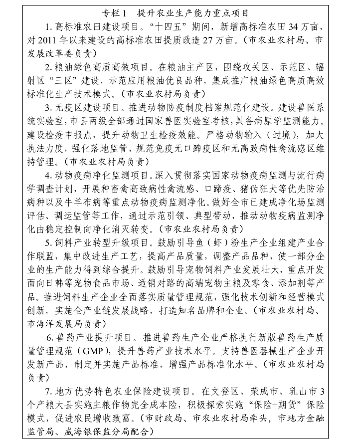 3.发展现代生态畜牧。把推广畜牧标准化生产贯穿于精致畜牧业建设全过程,围绕生猪、肉鸡、蛋鸡等产业,采取示范引导、项目补助等方式,规范场区布局,改造基础设施,优化装备配置,不断提升标准化生产水平,降低散养比重。优化畜牧产业布局,在乳山市冯家镇和文登区宋村镇、葛家镇打造种养循环型现代生猪养殖产业集群,在乳山市和文登区的丘陵地区打造现代化家禽养殖产业集群,推进养殖、屠宰标准化示范创建。壮大宠物日粮、零食、营养补充剂等专业化生产企业;推进饲料质量管理规范实施,加快兽药产业升级;培育兽用医疗器械产业,推进现有产品标准化体系建设。