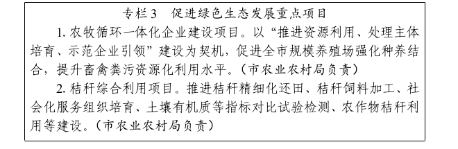 9.坚持推行绿色生态农业。围绕加快推进农业向集约高效、绿色安全方向转变,统筹推进化肥农药减量行动、农业废弃物资源化利用、农业面源污染治理等工作。支持各级政府与科研机构合作,组建绿色防控技术团队,围绕优势产业,研究制定绿色防控方案,大力推进病虫害专业化统防统治。推进农业机械与装备节能化,降低农机单位作业能耗。到2025年,农业面源污染治理取得显著成效,实现化肥农药减量增效,秸秆、畜禽粪肥有效利用,农膜与农药包装物基本回收,逐步形成与资源环境承载力相匹配、与生产生活生态相协调的农业绿色发展格局。(市农业农村局牵头,市生态环境局配合)
