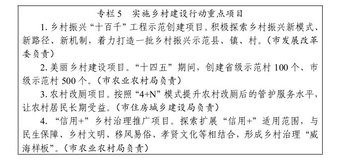“十四五”期间,以建设精致化城乡融合发展先行区为目标,紧紧围绕发展“四化一高”精致农业、建设“山海相拥”精美乡村、创树“以信为本”精细治理三大重点领域,实现我市农业高质量发展,乡村振兴战略全面推进,农业农村现代化建设走在全省前列。