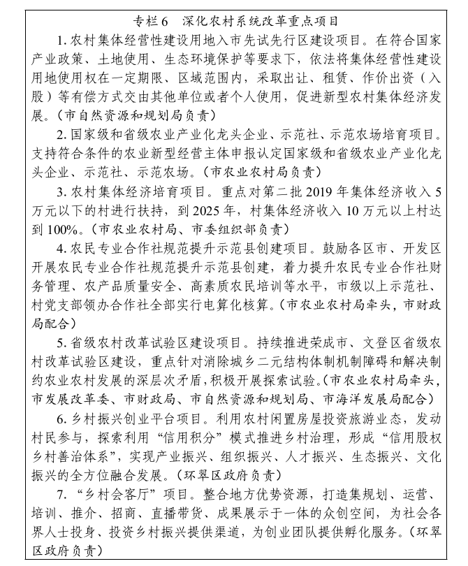 23.深化农村产权制度改革。推行村社分离,理顺基层党组织、村(居)委会和股份经济合作社三者关系,形成权责清晰、三力同向、高效运转格局。做好改革后发展文章,加强政策引导,有效利用农村集体各种资产、资源要素,推动资源集约利用和适度规模经营,探索集体经济发展新机制,提高村级组织自我发展和服务能力。(市农业农村局牵头,市委组织部、市民政局、市财政局、市自然资源和规划局、市林业局配合)