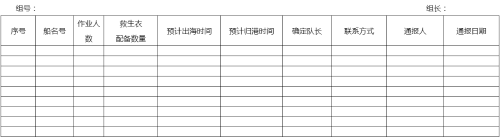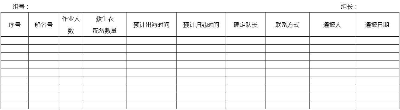 养殖渔船出海作业需提前向组长通报渔船名号、作业时间、出海人数、救生衣配备及联系方式等信息,由组长填写《养殖渔船出海通报登记表》并进行编队后出海作业。