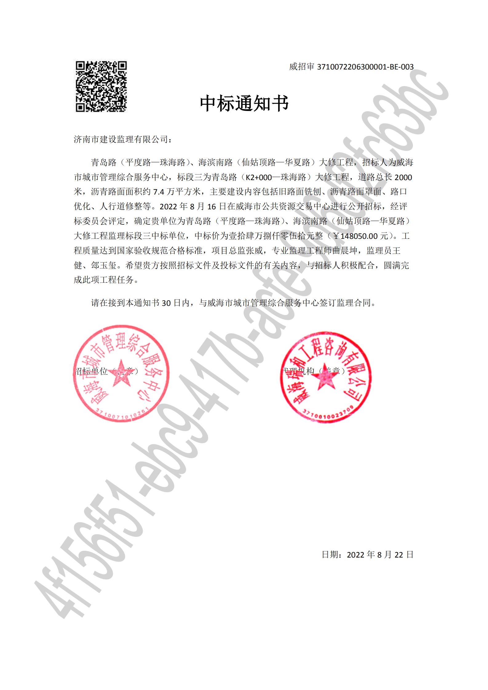网上十大正规赌网址大全官网 招标投标 青岛路(平度路-珠海路)大修工程监理单位中标通知书2
