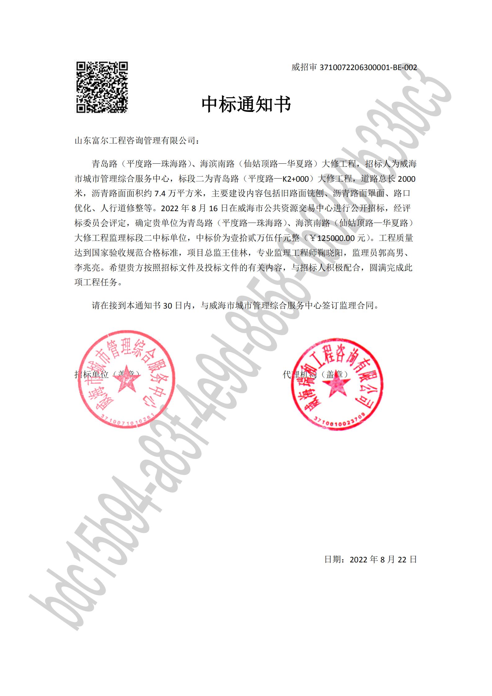 十大网赌靠谱网址 招标投标 青岛路(平度路-珠海路)大修工程监理单位中标通知书1