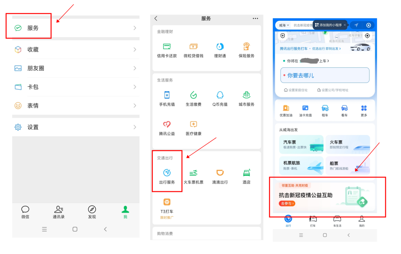 通过“微信—服务—出行服务—抗击新冠疫情公益互助”或微信搜一搜“出行服务”进入“腾讯出行服务”小程序均可进入。