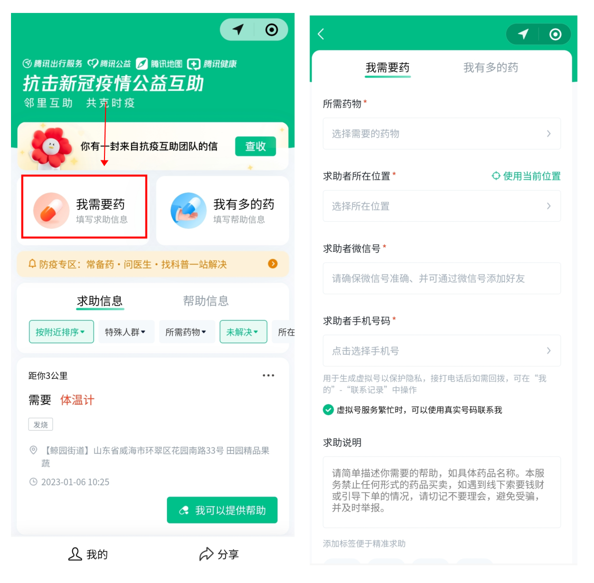 ■如果需要药,可选择“我需要药”,根据需求选择列表中国家卫健委推荐的居家常备非处方药,填写所在位置(求助者要把手机定位功能打开)、联系方式、求助说明等信息,完成实名认证后,将自己的用药需求发布到平台的信息广场。