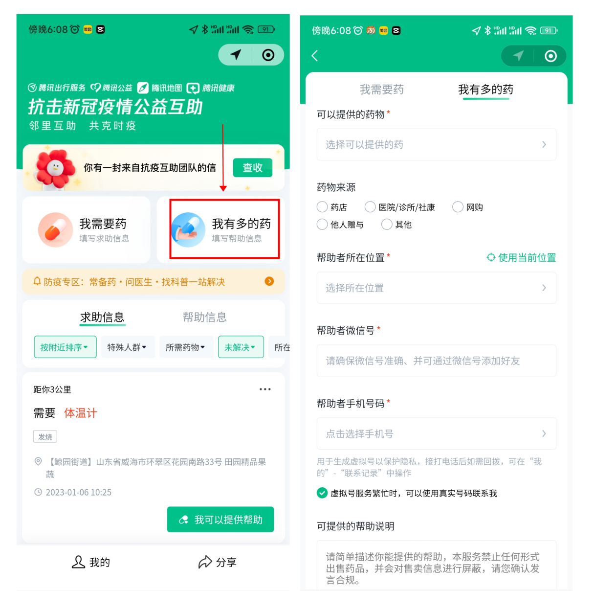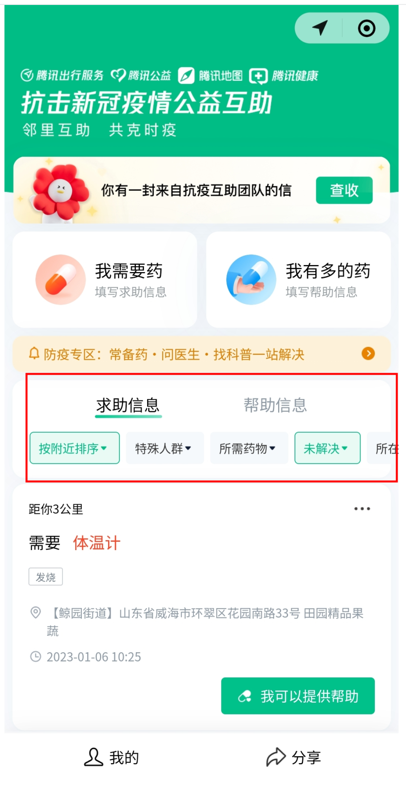 ■如果你有多余的药品可帮助到其他人,也可以选择“我有多的药”,填写相关信息和实名认证,地图基于位置定位功能,会在首页呈现离你最近的求助信息。在完成互助后,上传互助信息的市民可以选择“已解决”,下线互助信息。