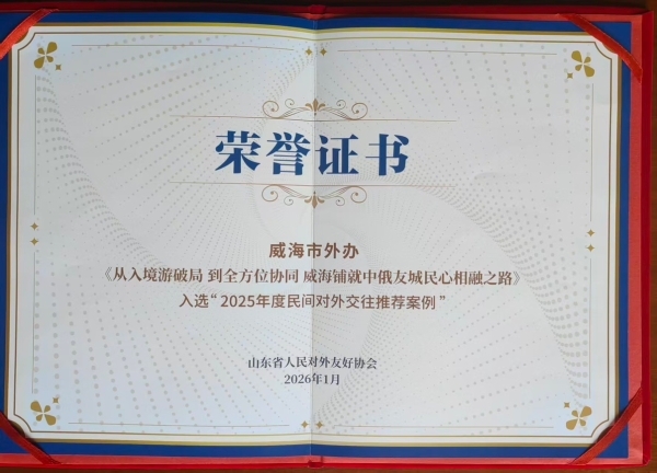 近日,2025山东省人民对外友好协会年会在济南召开。活动由省对外友协主办,省直部门、高校、企业、媒体等共100余人参加。会上,对2025年民间对外交往案例进行表彰,我办的《从入境游破局到全方位协同十大网赌靠谱网址铺就中俄友城民心相融之路》获评“2025年度民间对外交往推荐案例”。