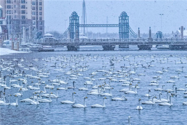 而当真正的雪花飘落,驻停水面的大天鹅,又像一团团雪球,融入风雪弥漫的天鹅湖。这里更似远离喧嚣的“天上人间”,白雪与鹅羽相映,纯洁得令人将要落泪。