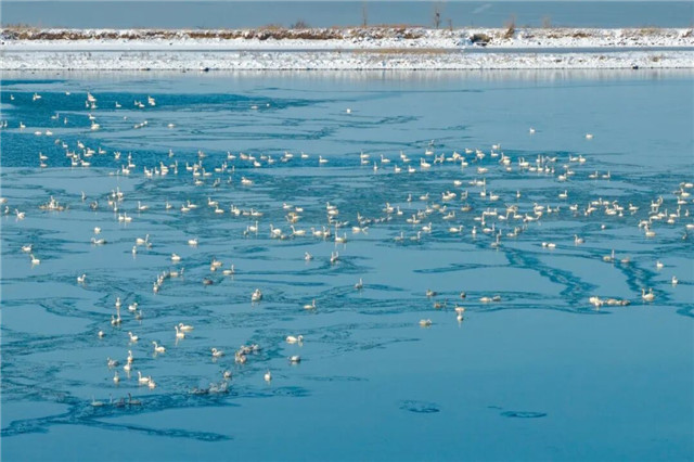 它们引吭高歌,它们翩翩起舞,这里没有噪音、远离污染,天地之间只有落雪纷纷与天鹅的鸣叫。伸手接过一片雪,便仿佛触摸到了柔软的羽毛,雪花融化在掌心的温度,或许是你与这些自然生灵正“心意相通”。