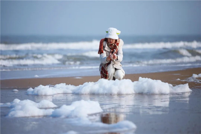 蜿蜒的钻石沙滩覆上了纯白的雪,层层叠叠的泡沫海推来大海深处的呼唤,几处多巴胺颜色的打卡置景好像插在雪中的指路牌,指引着“雪落海域”的专属浪漫。