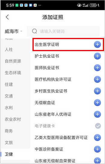 选择【卫健】分类下的“出生医学证明”,点击“+”,申领电子证照。