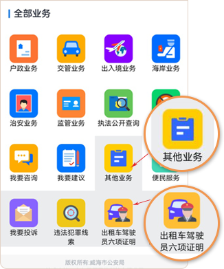 在“全部业务”栏“其他业务”中点击“出租车驾驶员 六项”进行申请