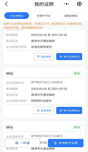 出租汽车驾驶员从业资格电子证照的申领、亮证亮码、查询核验,可通过“全国道路运输电子证照”、“道路运政一网通办”