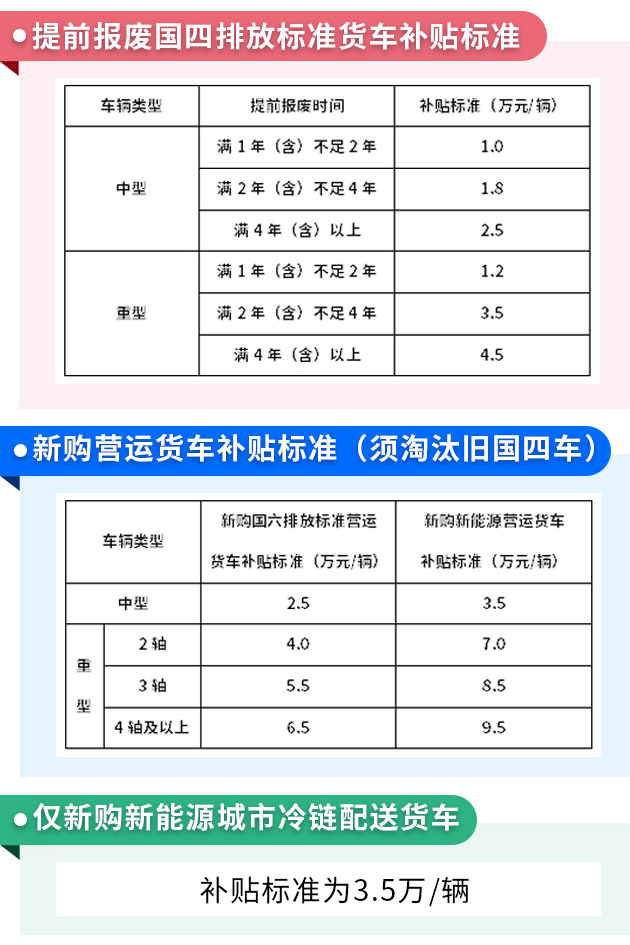 *根据老旧营运货车报废车辆类型、提前报废时间和新购置车辆动力类型等,实施差别化补贴标准。