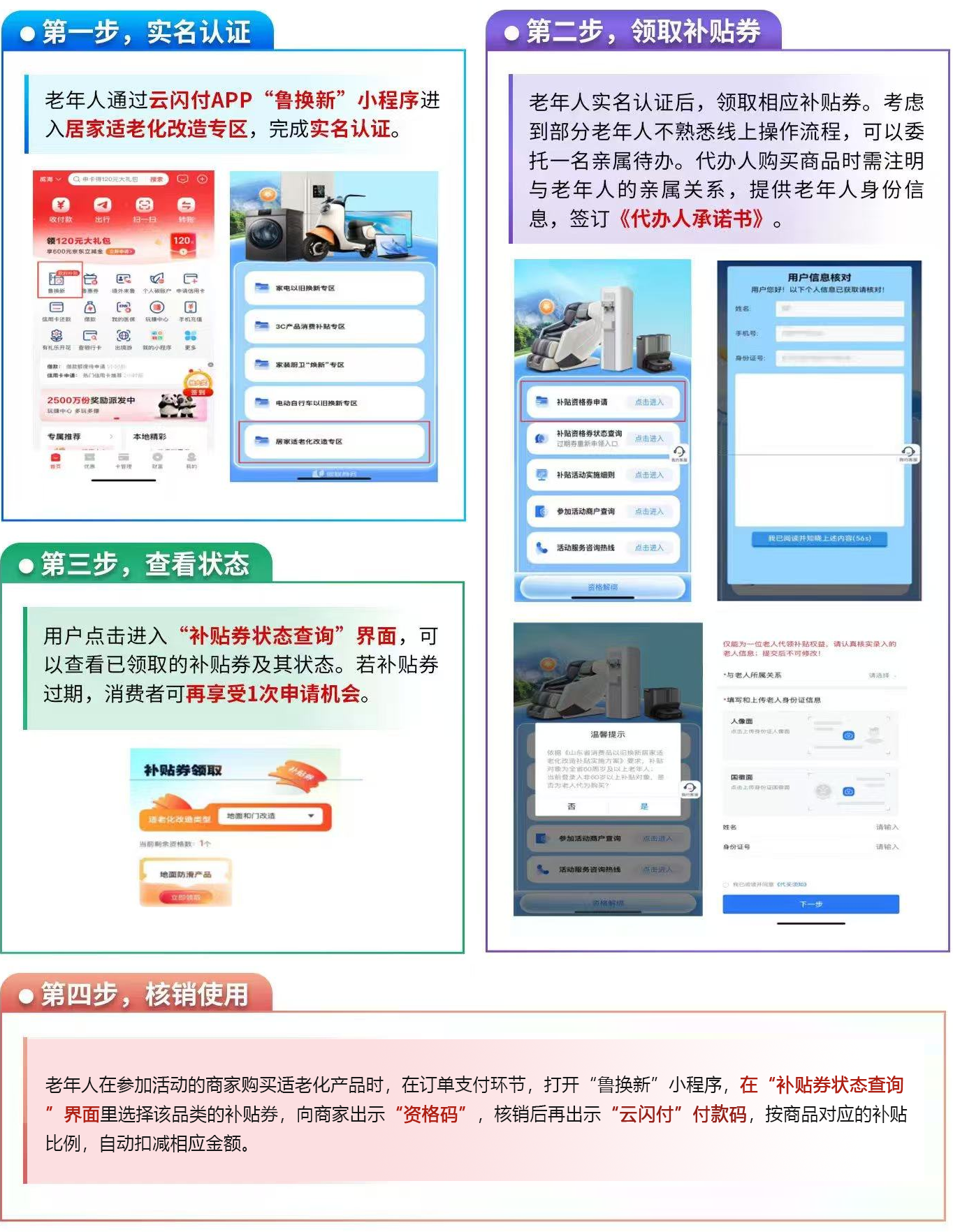 *居家适老化改造补贴采取支付立减的方式,补贴资金由商家垫付。商家通过居家适老化改造补贴服务模块提交相关资料,审核通过后,集中向商家兑付。