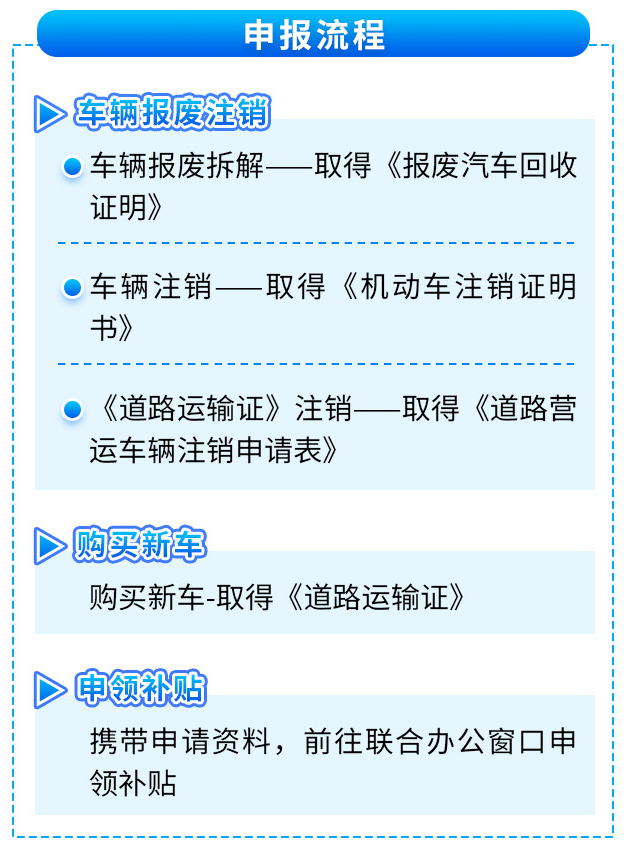 我市辖区范围内注册登记的国四排放标准中型、重型营运货车(2025年7月7日起由外地转入我市的车辆不享受补贴),需持有公安机关开具的《机动车注销证明书》和具有资质的(本市或外地)报废机动车回收拆解企业开具的《报废机动车回收证明》,及车辆注销前,交通运输或行政审批部门发放的有效《道路运输证》。