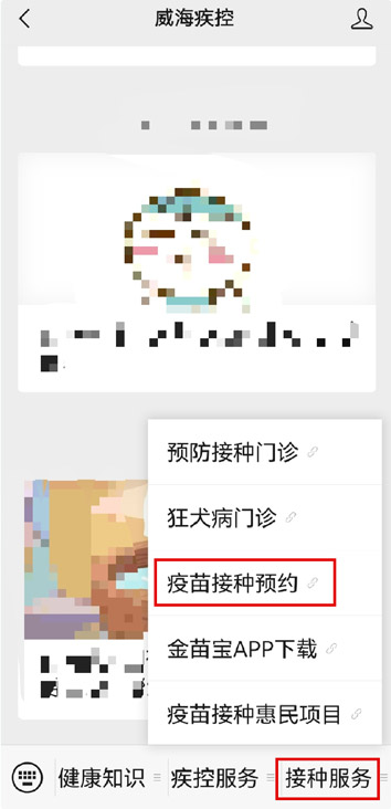 2.在公众号首页右下角点击“接种服务”按钮,选择选择“疫苗接种预约”