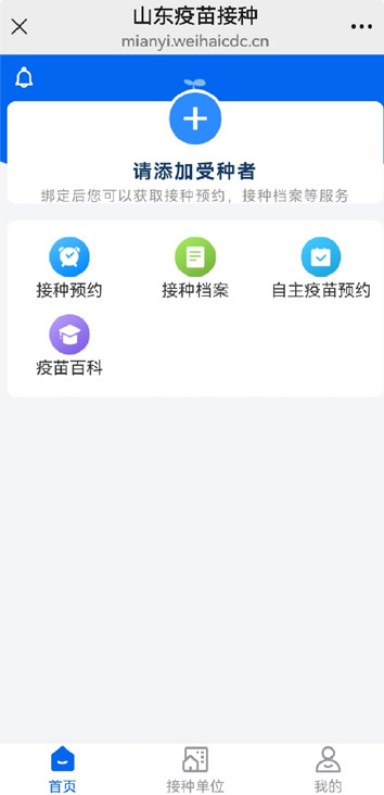 2.点击“疫苗接种”导航页右上角【⊕】,可增加绑定受种者。