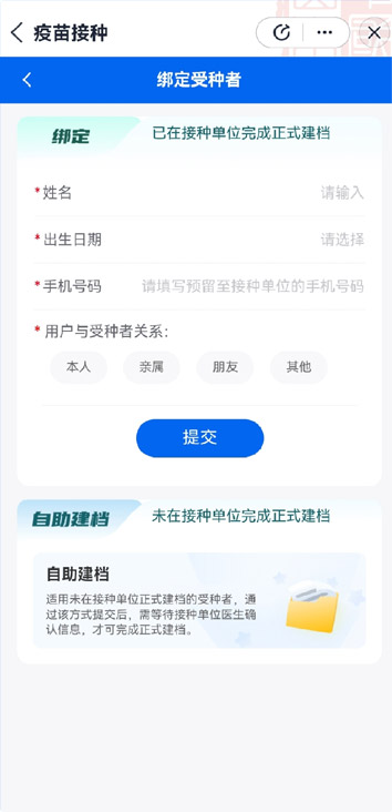 1.点击【添加受种者】,根据提示填写信息并提交,绑定个人信息。