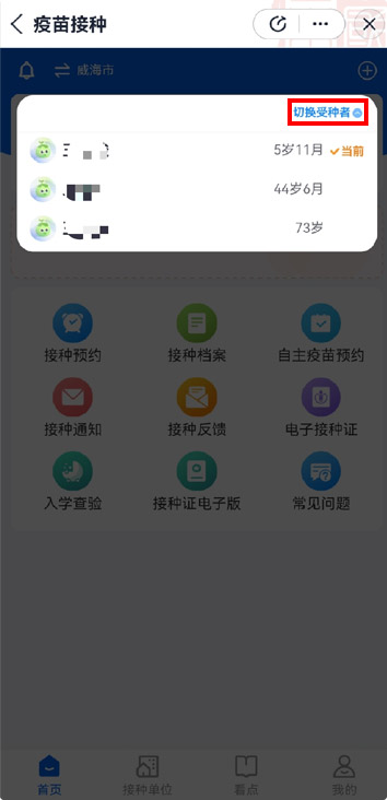 3.点击【切换受种者】,可以切换到已绑定人员预防接种信息页。