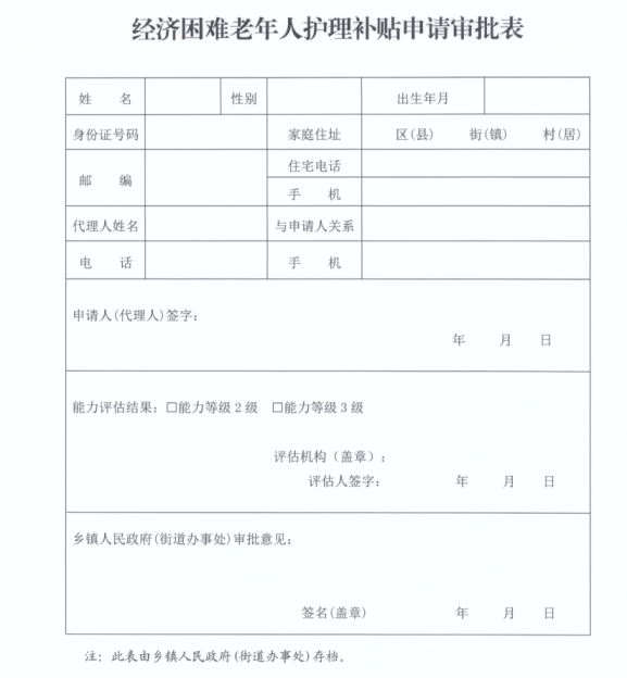由老年人本人、家庭成员或委托代理人向申请人户籍所在地乡镇人民政府(街道办事处)提出申请,提交《经济困难老年人护理补贴申请审批表》。