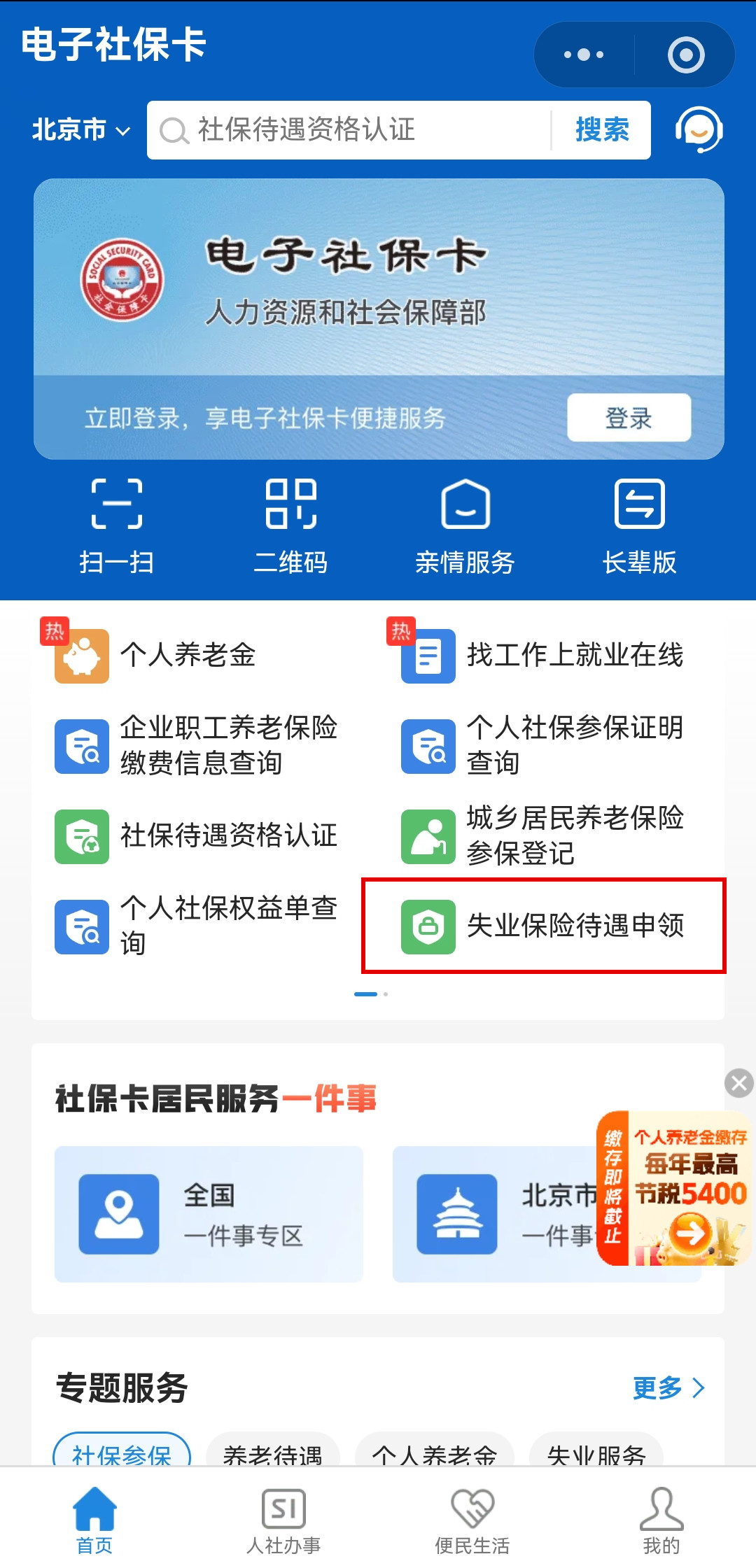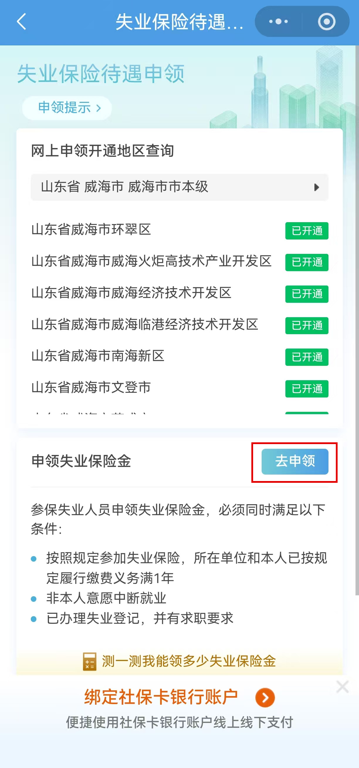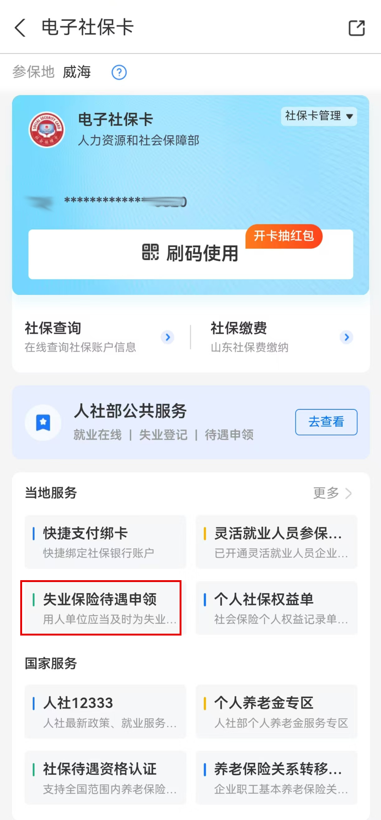 | 支付宝搜索“电子社保卡”小程序。 | 进入电子社保卡,点击【失业保险待遇申领】进行申请 | 微信搜索“电子社保卡”小程序,点击【失业保险待遇申领】 | 点击【去申请】 |