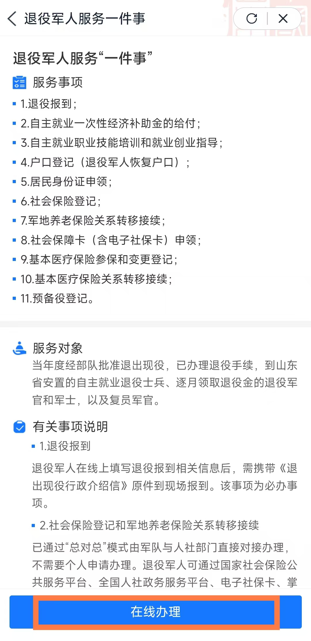 自主就业一次性经济补助金的给付、自主就业职业技能培训和就业创业指导、户口登记(退役军人恢复户口)、社会保障卡(含电子社保卡)申领、基本医疗保险参保和变更登记实行线上联办,申请人可通过“爱山东”移动端或十大网赌靠谱网址平台政务服务网“高效办成一件事”专区设置的退役军人服务“一件事”模块申请办理。