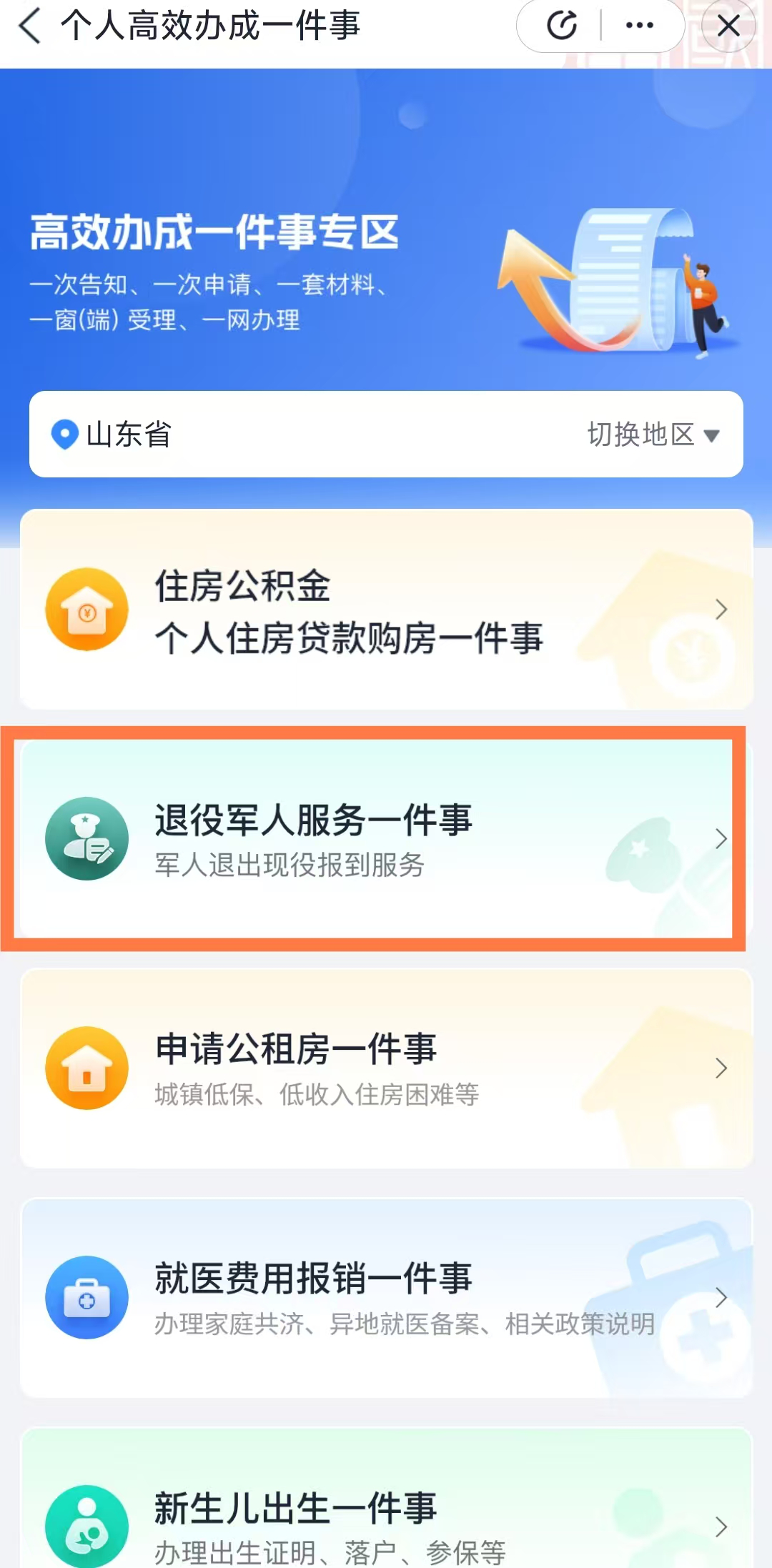 下载安装最新版本“爱山东”APP,然后登录账号 | 在首页点击“高效办成一件事” | 下滑找到退役军人服务“一件事” |