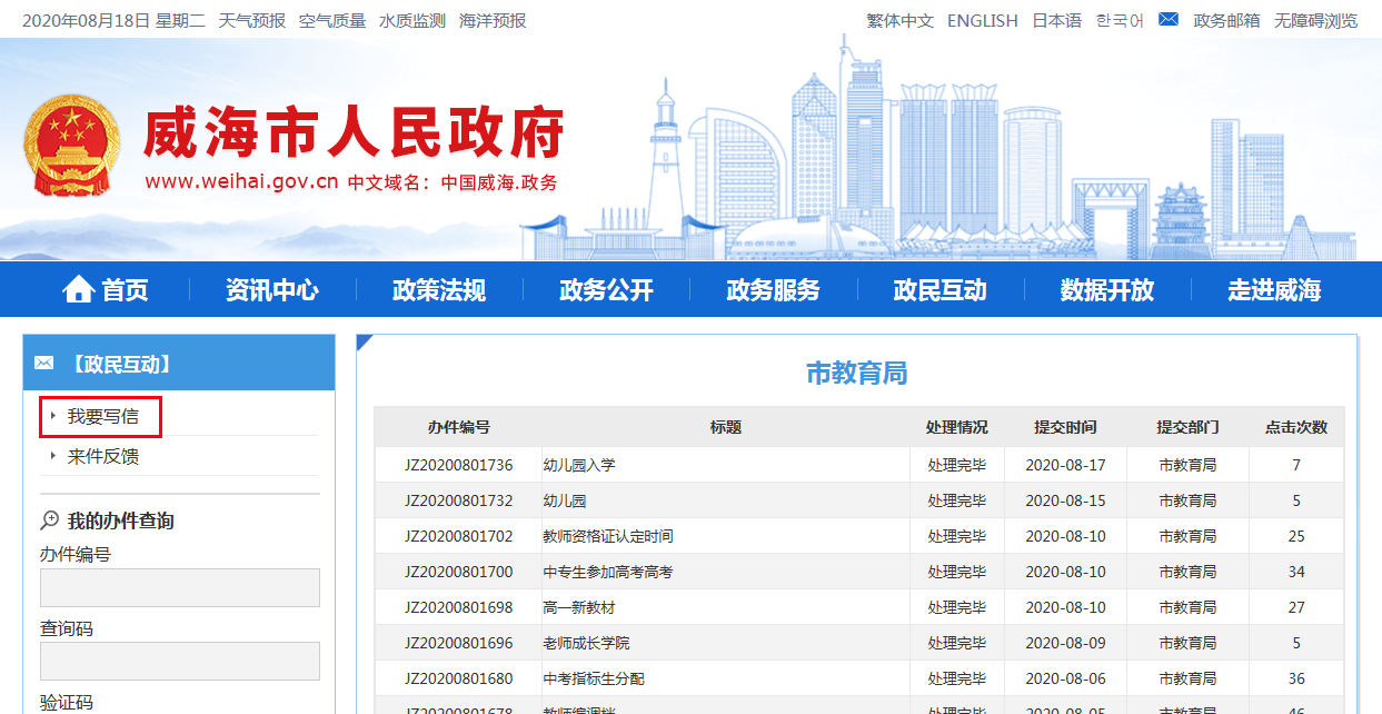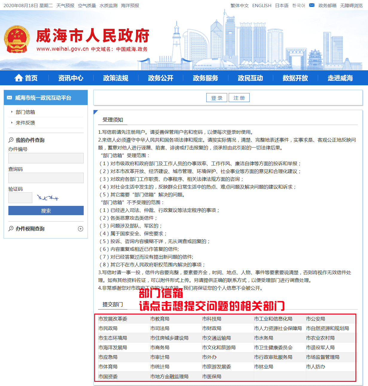 点击相关部门,进入相关部门信箱单独页面,再点击【我要写信】提交问题。