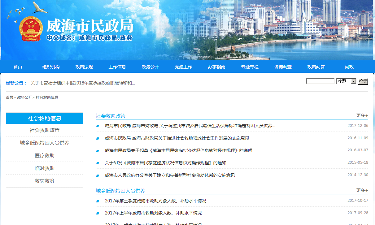 为进一步做好政府信息公开重点领域中民政部分的信息工作,今年,在完成行政权力信息、本单位经费使用情况等信息公开的同时,重点抓好了城乡低保、特困人员供养、医疗救助、临时救助等社会救助信息公开工作。实行社会救助政策和办理流程公开,通过市局网站的政策专栏,公开社会救助政策。通过政府信息公开栏和局官方网站的社会救助专栏、办事指南栏目,对城乡低保、农村五保供养工作流程进行公开。通过专栏,将社会救助信息分类发布,城乡特困人员救助人数、救助标准、补助水平实行每月公开,对医疗救助和临时救助人数及资金支出等信息通过市政府社会救助专栏和市局网站定期公开,发布信息涉及全市2.1万户低保家庭和1万余名五保老人。