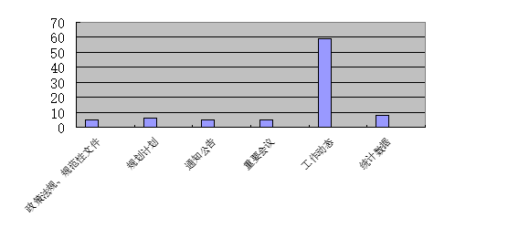 四、主动公开政府信息及公开平台建设情况。2015年,我单位共主动公开政府信息104条。从内容分类看,政策法规、规范性文件5条,规划计划6条,通知公告5条,重要会议5条,工作动态59条,统计数据8条,信息公开制度15条,年度工作报告1条。