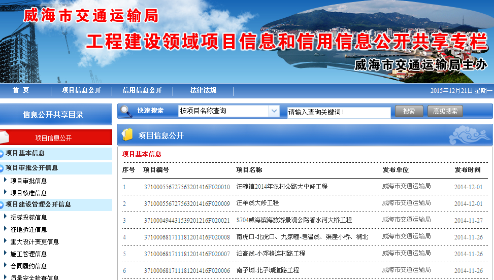 2015年,我局及时向社会公开了调整后的行政权力清单和责任清单,公开了部门预决算及“三公”经费,并在门户网站上设置了“交通工程项目信息、信用信息公开”栏目。