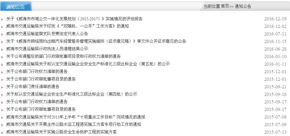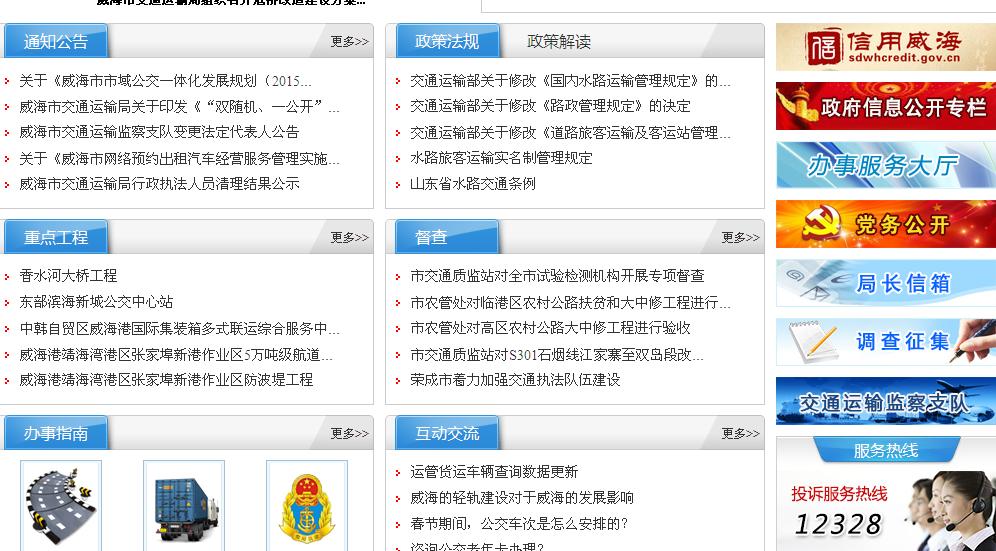 (三)进一步拓宽交流渠道。2016年11月,我局继续完善更新门户网站,界面更丰富,栏目设置更清晰,并增加了“政策解读”、“督查”等新栏目,增加了指向“信用十大网赌靠谱网址平台”、“政府信息公开专栏”、“办事服务大厅“、“交通运输监察支队”“规划计划“、”统计数据”、“财政预决算”、“权力清单”、“年度工作报告”等网址的链接。