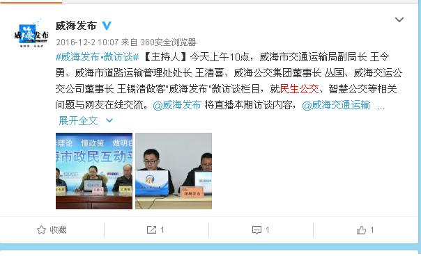 12月2日,副局长王令勇、市道路运输管理处处长王清喜、公交集团董事长丛国、交运公交公司董事长王锡清在“十大网赌靠谱网址平台发布”微访谈栏目,就民生公交、智慧公交等相关问题与网友在线交流,2次微访谈共发布了16条信息。