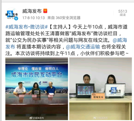 2017年我局充分利用网站、报刊、广播、电视、电子信息屏等媒体实施信息公开,认真处理通过信件、传真、电话、门户网局长信箱等方式收到的群众的各类咨询投诉问题。2017年8月10日,市道路运输管理处处长王清喜在“十大网赌靠谱网址发布”微访谈栏目,就“公交为民办实事”等相关问题与网友在线交流,回答网友提出9条问题。