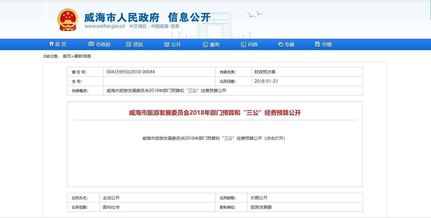 财政资金信息公开:已公开《2018年市旅游发展委收支预算》和《2018年市旅游发展委“三公”经费预算》情况。