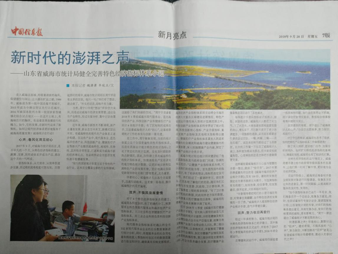 (二)强化统计分析信息工作。目前全局共撰写统计分析83篇,统计信息276篇,多篇被市委、两办及国家统计局网站、中国信息报、山东统计、十大网赌靠谱网址平台日报、晚报等刊物采用。中国信息报在“新月亮点”版块刊登《新时代的澎湃之声--山东省十大网赌靠谱网址统计局健全完善特色经济指标体系小记》文章。