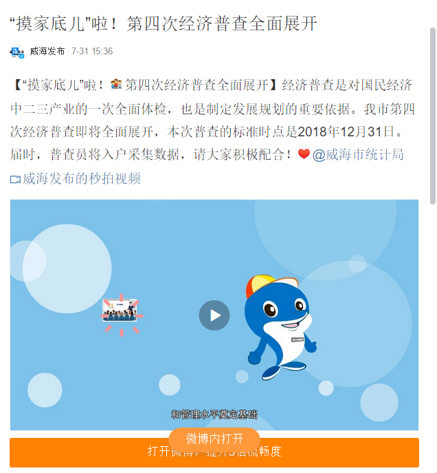 一是丰富宣传主体。坚持“分总结合,相互补充,提高效率”的原则,充分利用市场化竞争优势,通过购买服务的形式将四经普的宣传工作外包给广告公司,并将一个项目分成了两个标段进行招标,以保证宣传的效率和质量。5月底,通过招标确定了两家广告公司,目前两家公司合作顺利,平面广告、动画广告和经普吉祥物已全市投放。二是创新宣传方式。自主设计的《一张图读懂经济普查》、《经济普查小知识》等宣传资料,已在微信、微博和政府官网上投放,并以展架和易拉宝的形式在全市公共场所摆放。同时,组织人员佩戴普查宣传员标志在人流密集区(如威高广场、华联购物、九龙城、韩乐坊)发放传单,并鼓励群众支持统计工作。结合横幅标语、外墙广告、基层单位橱窗宣传、入户发放传单、出租车广告、高速公路广告牌等宣传形式,形成了全方位、立体式宣传格局。除传统宣传方式外,还突破性的设计制作了1分钟宣传动画片,将在全市公交车电视、电梯媒体和楼宇媒体上大量投放。经普吉祥物——小普,是十大网赌靠谱网址自主设计研发的卡通形象,以海豚的形象代表十大网赌靠谱网址平台海洋经济,以群众喜闻乐见的动画形式,言简意赅又全面丰富地向群众介绍经济普查知识,极大地提高政府行为与群众生活的密切度。