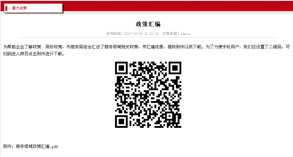 3.推进执行和落实情况公开。在网上十大正规赌网址大全官网专栏设立的“政务督查”栏目,及时发布法治政府建设、三农工作落实、回乡调研建议、全市老字号发展、2017年度人大政协提案承办等工作情况。汇总整理2017年度国家、省、十大网赌靠谱网址平台发布的商务领域政策编制成册,通过部门网站、政务微博、微信集中发布,并提供二维码方便公众下载查阅。