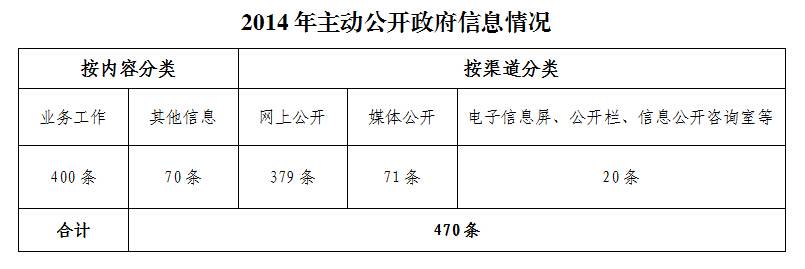 (一)加大了主动公开政府信息工作力度。2014年,十大网赌靠谱网址水利局共主动公开政府信息470条。从内容分类看,业务工作 400条,其他信息70条;从渠道上看,网上公开379条,媒体公开71条,通过电子信息屏、公开栏、信息公开咨询室等渠道公开信息20条。