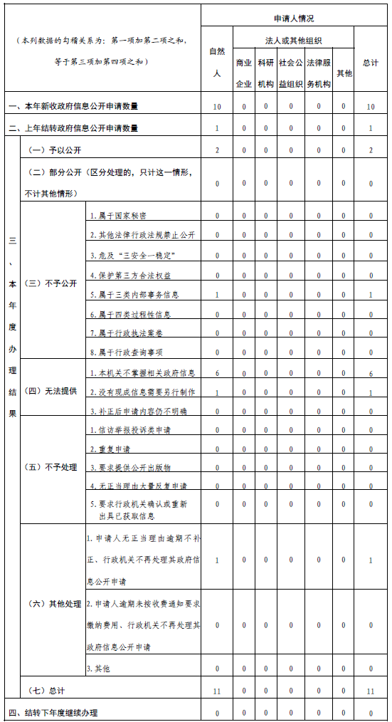 (二)依申请公开。建立依申请公开疑难件办理会商机制,加强与司法局、法律顾问的沟通衔接,提高答复书专业性和答复的精准度。全年通过网上申请、信函邮寄等渠道受理政府信息依申请公开10件,上年度结转1件,同比增长25%,申请内容主要涉及军转安置。因政府信息依申请公开引发行政复议案件2件。